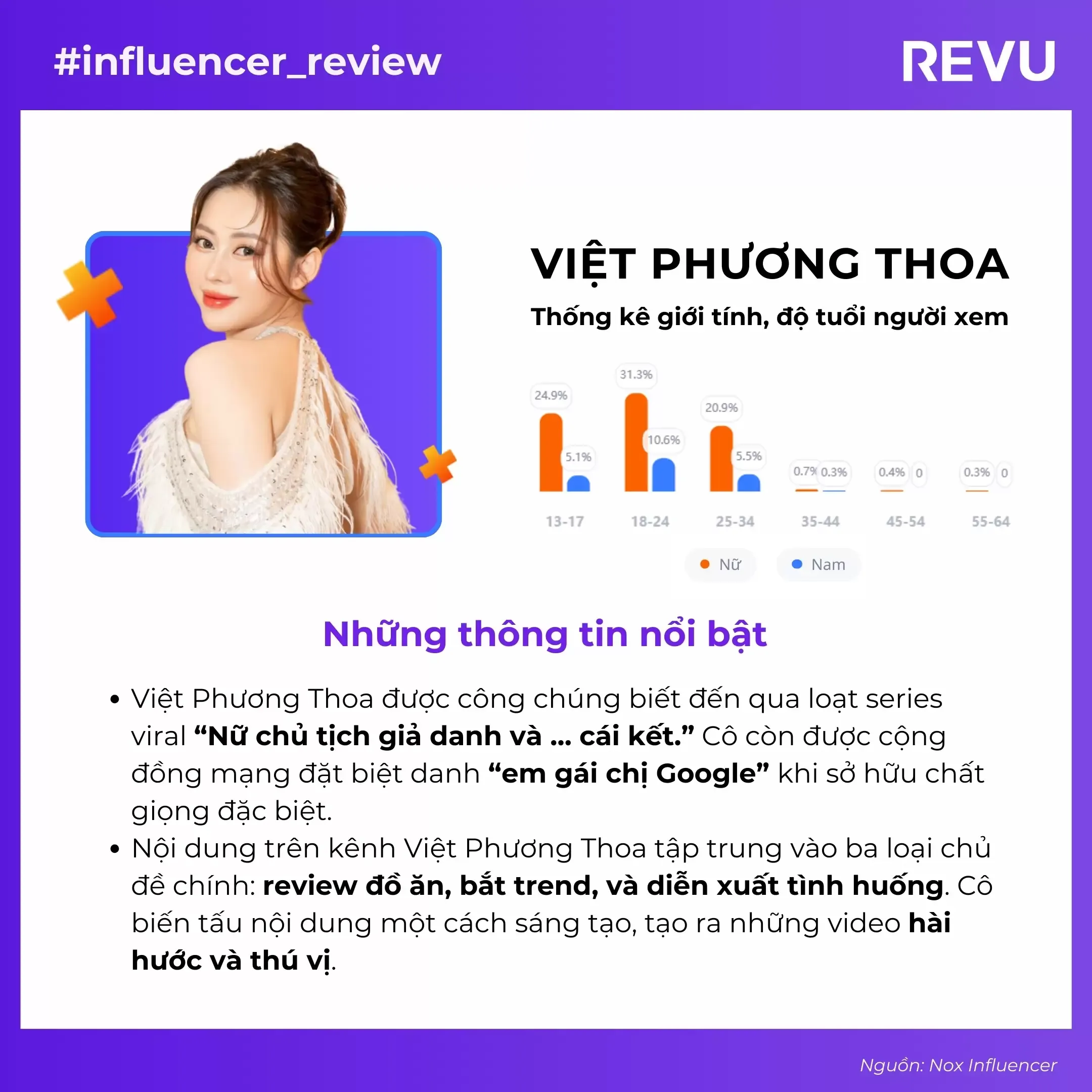 Nguyễn Việt Phương Thoa được biết đến rộng rãi qua series viral “Nữ chủ tịch giả danh”. Cô còn được cộng đồng mạng đặt biệt danh “em gái chị Google” nhờ chất giọng đặc biệt và khả năng biến hóa đa dạng. Phương Thoa ấp ủ giấc mơ diễn xuất từ lâu và đã gặt hái thành công nhất định.