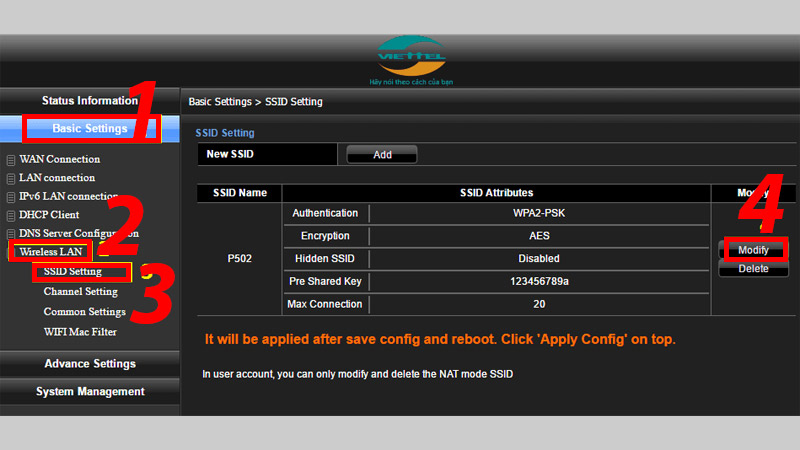 Sau khi đăng nhập, tìm và truy cập vào mục Basic Settings. Từ đó, chọn Wireless Lan và sau đó là SSID Setting. Cuối cùng, nhấn Modify.