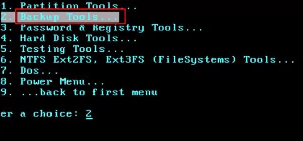 Tiếp theo, bạn sẽ thấy danh sách các công cụ trong môi trường DOS. Nhấn phím 2 để chọn Backup Tools… Đây là nơi chứa các công cụ sao lưu và phục hồi.