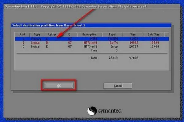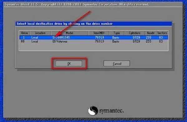 Phần mềm sẽ hiển thị danh sách các ổ đĩa. Thông thường sẽ có ổ cứng HDD/SSD và USB. Ổ USB có dung lượng nhỏ hơn. Bạn cần chọn ổ đĩa chứa phân vùng cần ghost (thường là ổ cứng chính). Sau đó, nhấn OK.