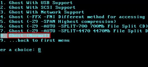Cuối cùng, bạn nhấn phím 8 để chọn Ghost (Normal). Thao tác này sẽ khởi động chương trình chính. Lúc này bạn đã sẵn sàng tiến hành khôi phục hệ thống Windows.