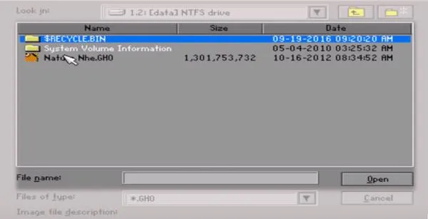 Sau khi chọn đúng file .GHO, bạn nhấn Open. File ghost sẽ được tải vào bộ nhớ của Norton Ghost.