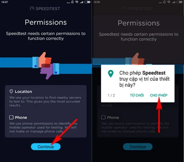 Trong lần đầu sử dụng ứng dụng Speedtest, bạn cần nhấn chọn mục “Permission” và xác nhận Cho phép để cấp quyền.