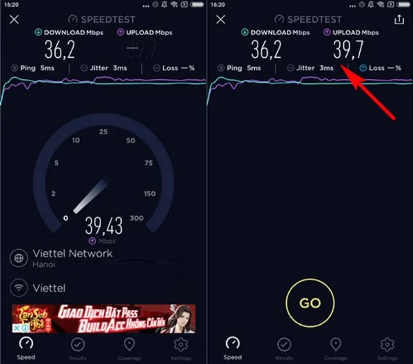 - Nhấn nút ảo “GO” để hệ thống bắt đầu đo lường tốc độ mạng di động.