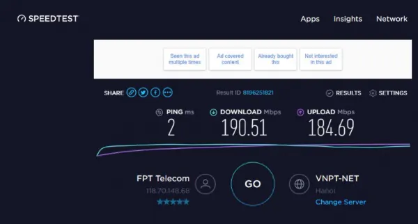 - Kết quả kiểm tra sẽ hiển thị Ping (ms), tốc độ Download (Mbps) và tốc độ Upload (Mbps).