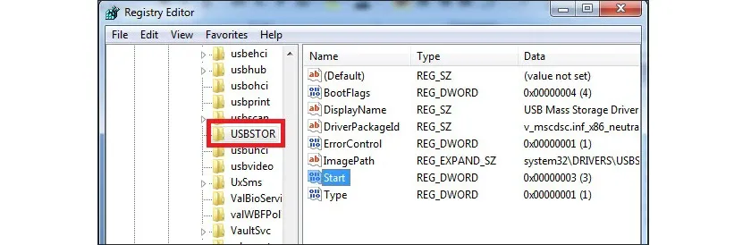 Điều hướng theo đường dẫn sau: HKEY_LOCAL_MACHINESYSTEMCurrentControlSetServicesUSBSTOR.
