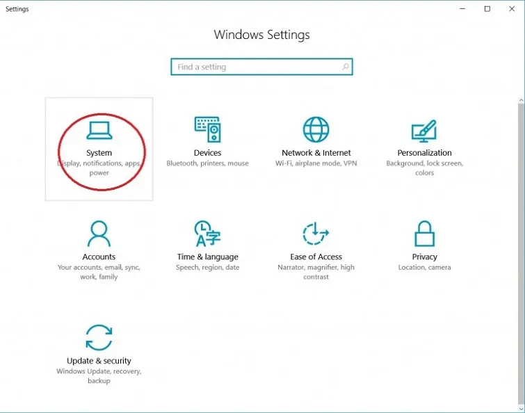 Bước 3: Trong cửa sổ Settings, chọn mục “System”. Mục “System” chứa các cài đặt liên quan đến hiển thị, âm thanh, thông báo và nguồn.