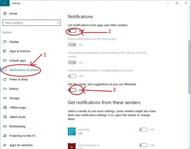 Bước 3: Ở menu bên trái, nhấn “Notifications & actions”. Dưới phần “Get notifications from these senders”, bạn sẽ thấy danh sách các ứng dụng. Tìm ứng dụng mà bạn muốn tắt thông báo và kéo thanh trượt sang vị trí “Off”.