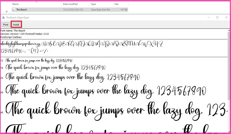 - Nhấn vào nút Install Font (Cài đặt Font) ở dưới cùng.