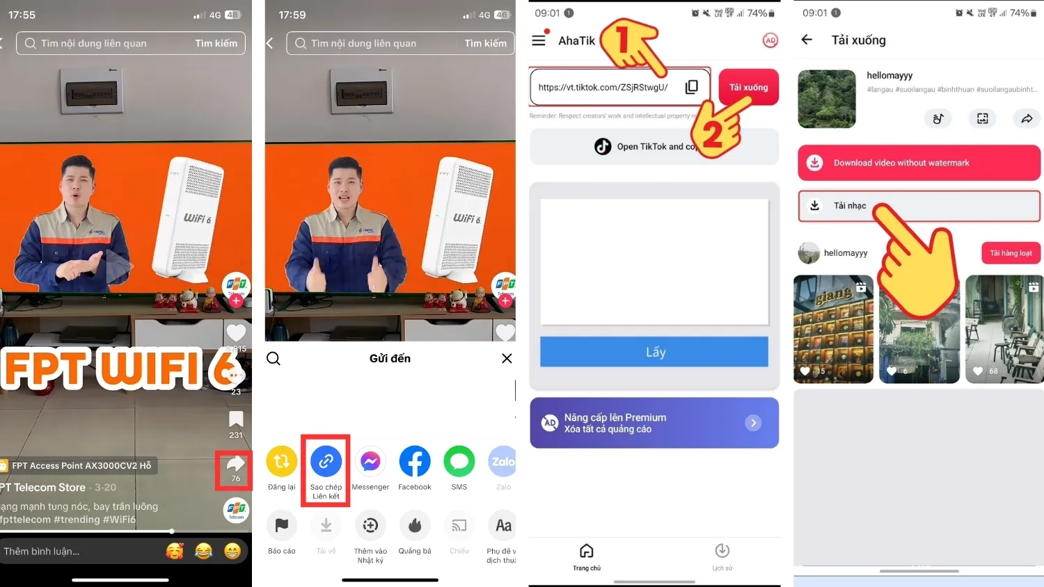 Sao chép liên kết video TikTok, dán vào AhaTik và chọn “Tải nhạc” để lưu file MP3